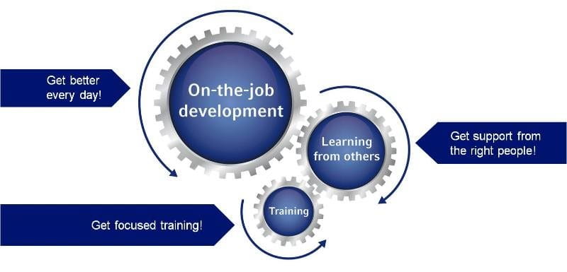 Entwicklung beginnt für uns mit einer Reflexion der Kompetenzen. Gemeinsam erstellen wir einen maßgeschneiderten Entwicklungsplan. Dieser kombiniert herausfordernde Aufgaben, Eigenverantwortlichkeit im Lernen von anderen (u. a. mit Mentoren und Coaching) sowie Trainingsprogramme für spezielle Funktionen oder Führungskräfte.