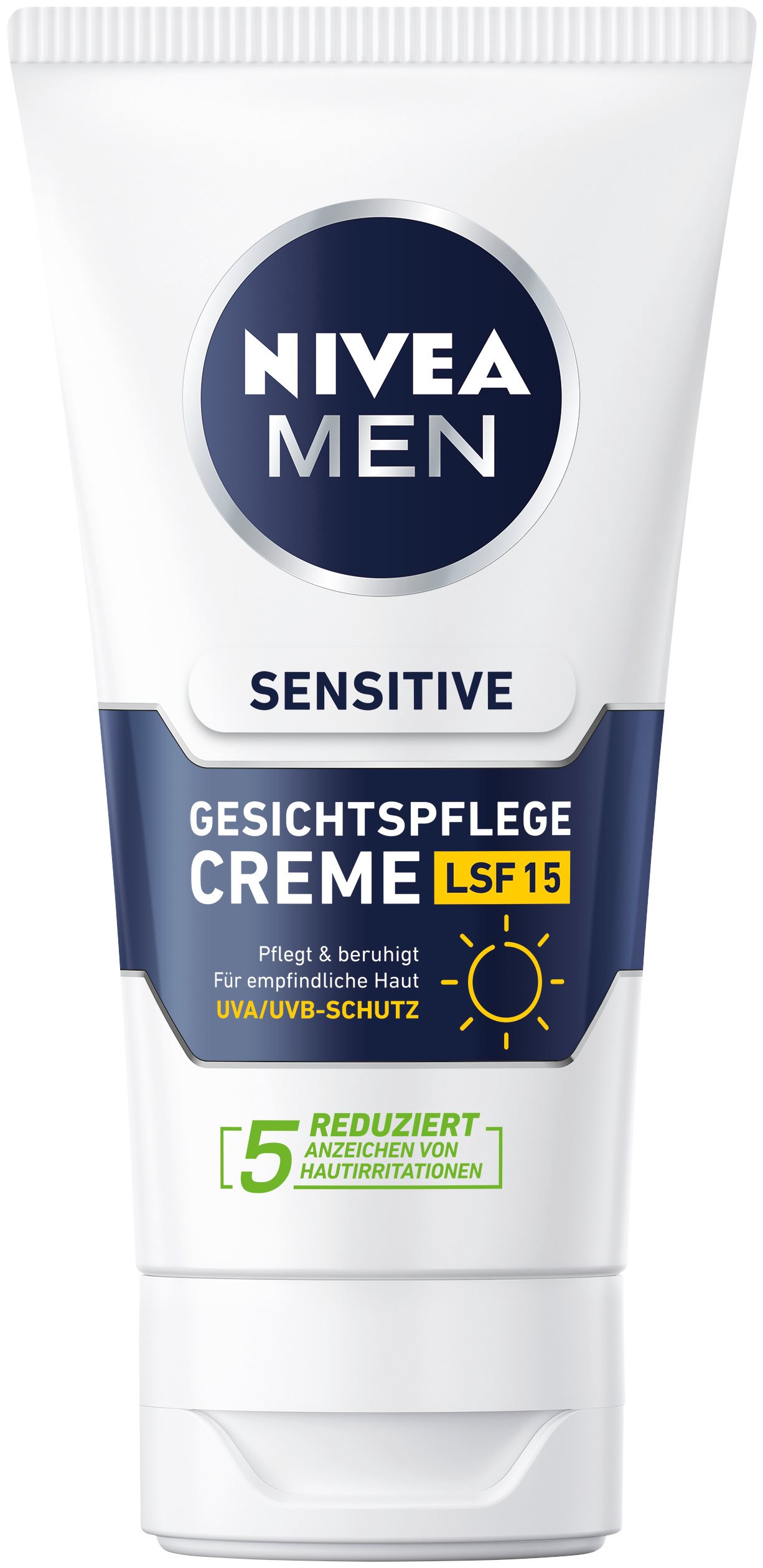 Die neue NIVEA MEN Sensitive Gesichtspflege Creme LSF 15 pflegt und beruhigt empfindliche Männerhaut, reduziert die fünf Anzeichen von Hautirritationen und bietet dank LSF 15 zusätzlich einen UVA/UVB-Schutz vor vorzeitiger lichtbedingter Hautalterung.